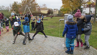 Das Spielangebot des Spielplatzes Jaczostraße Ecke Scharfe Lanke wurde mit der Unterstützung des Projektpartners Berliner Wasserbetriebe um einen individuellen Wasserspielbereich erweitert. Das besondere dieser Maßnahme ist, dass Auszubildende des Straßen- und Grünflächenamtes und der Berliner Wasserbetriebe gemeinsam diese Wasserspielanlage bauten. Die künftigen Gärtner und Anlagenmechaniker lernten dabei, miteinander Wasserrohre zu verlegen und sie anzuschließen. In einer späteren Bauphase übten sie Gelände zu modellieren und mit Pflastersteinen umzugehen. Bei der gemeinsamen Arbeit konnten die Auszubildenden untereinander Kontakte knüpfen und ihr jeweiliges Wissen austauschen.
