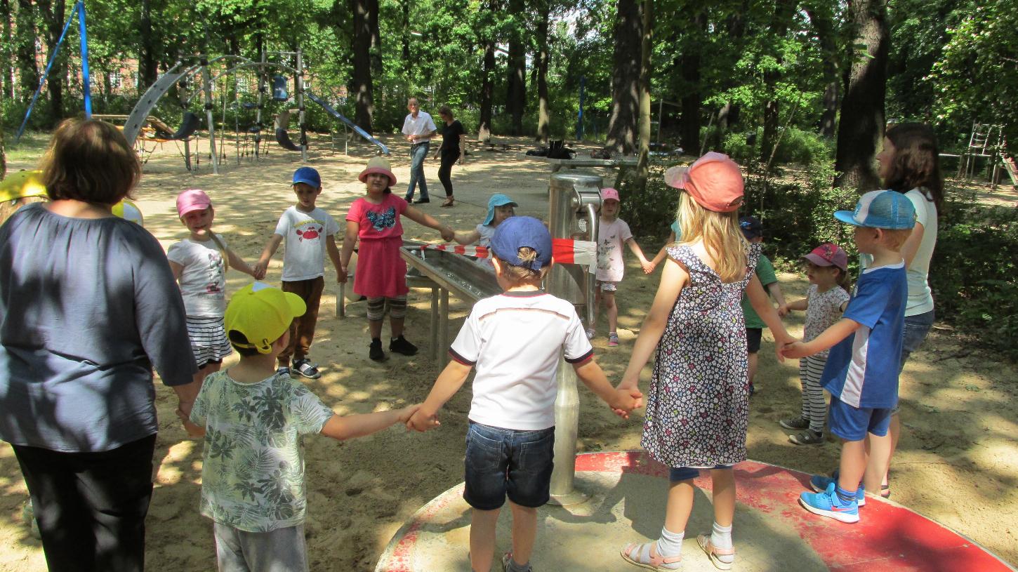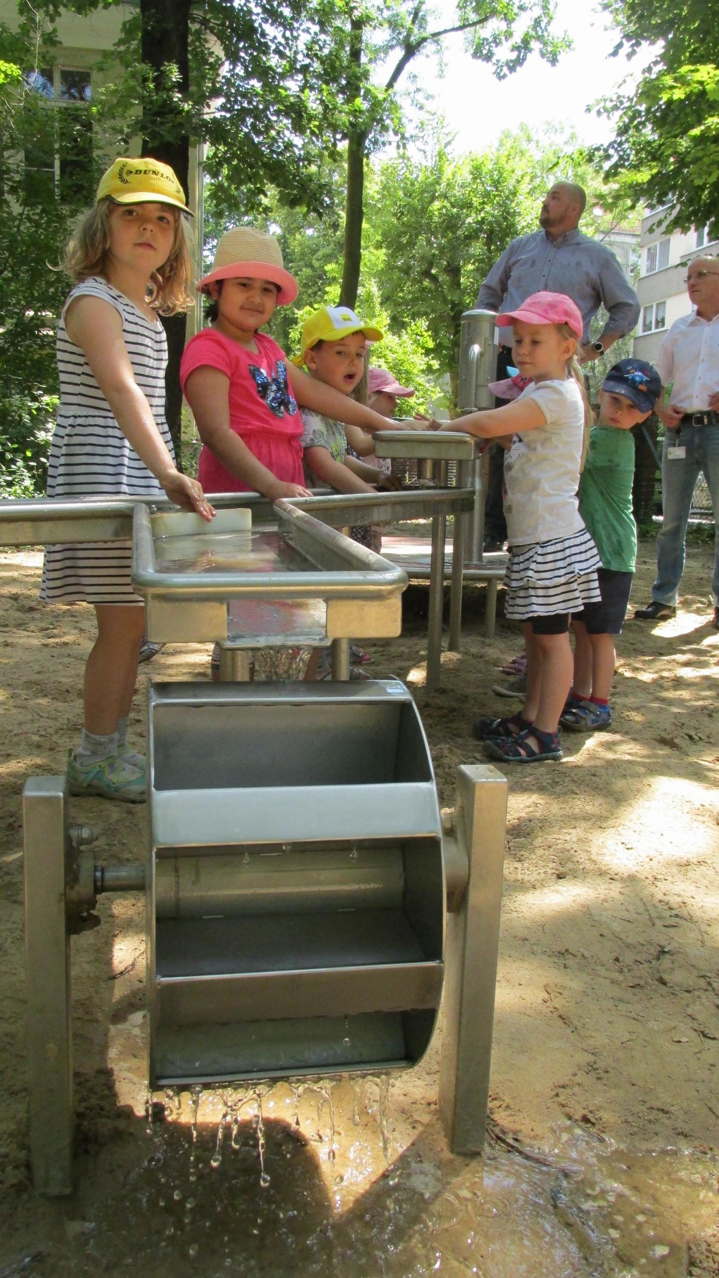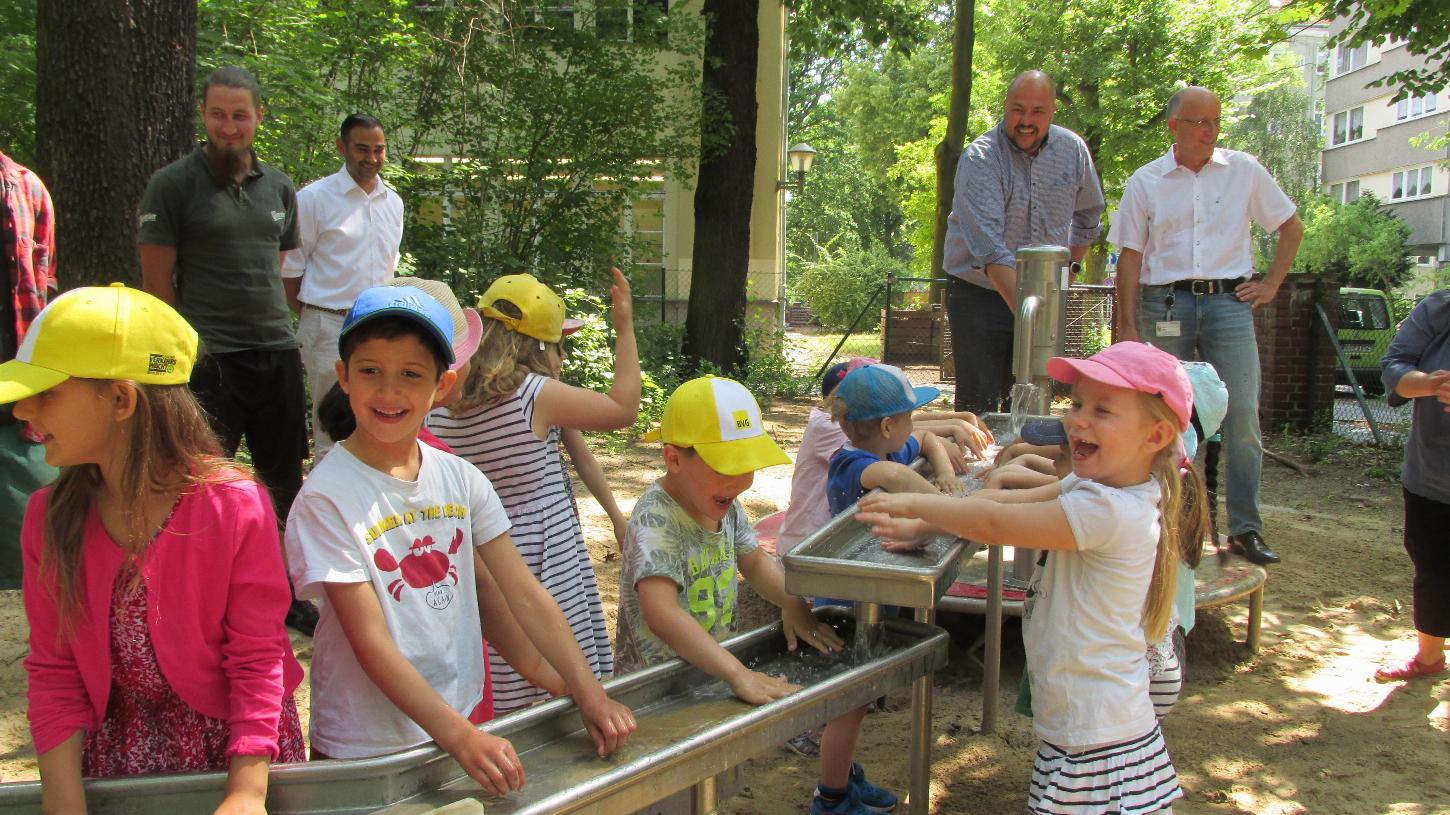 Am 17. Juni 2019 weihten Bezirksstadtrat Frank Bewig und Standortleiter Jürgen Genger der BSH Hausgeräte GmbH gemeinsam mit der Kita Immerfrech als langjähriger Spielplatzpate feierliche die Wasserspielanlage ein.