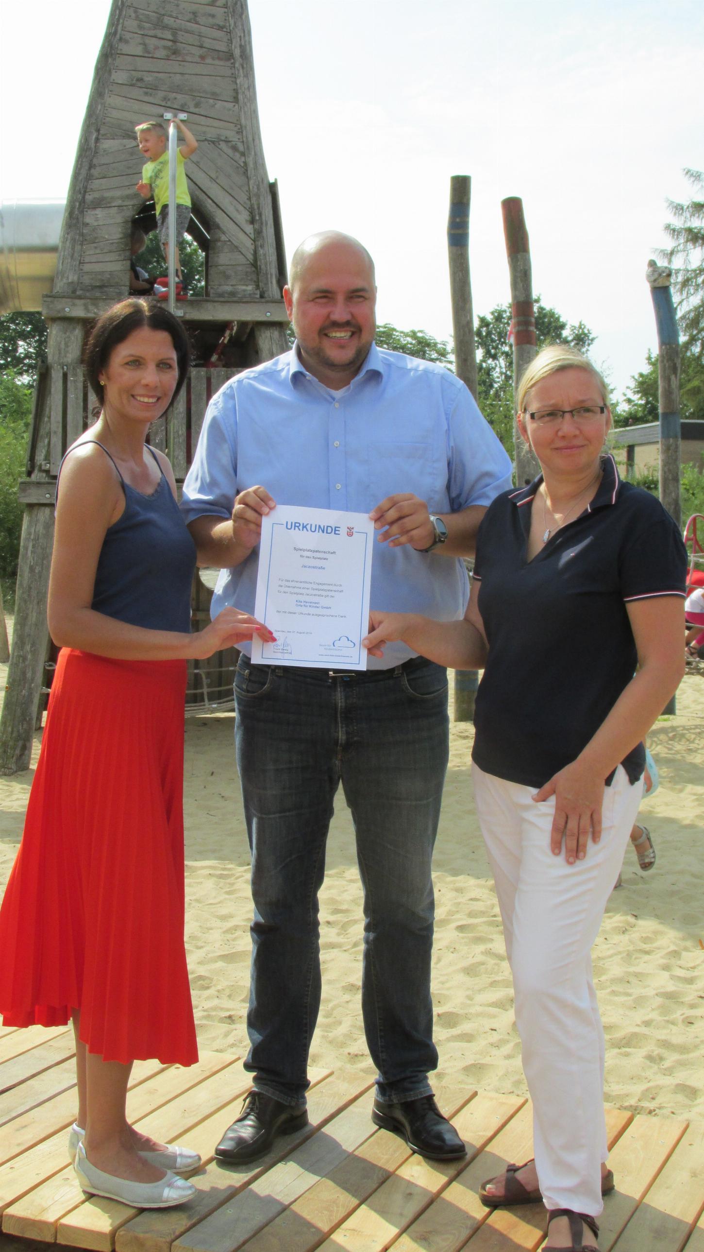 Bezirksstadtrat Frank Bewig übergab feierlich den Kindern der Kita Havelnest, seiner Leiterin Frau Van der Wyst (Foto rechts) und Frau Oßmann (Foto links)am 07. August 2019 die Urkunde für die übernommene Patenschaft.