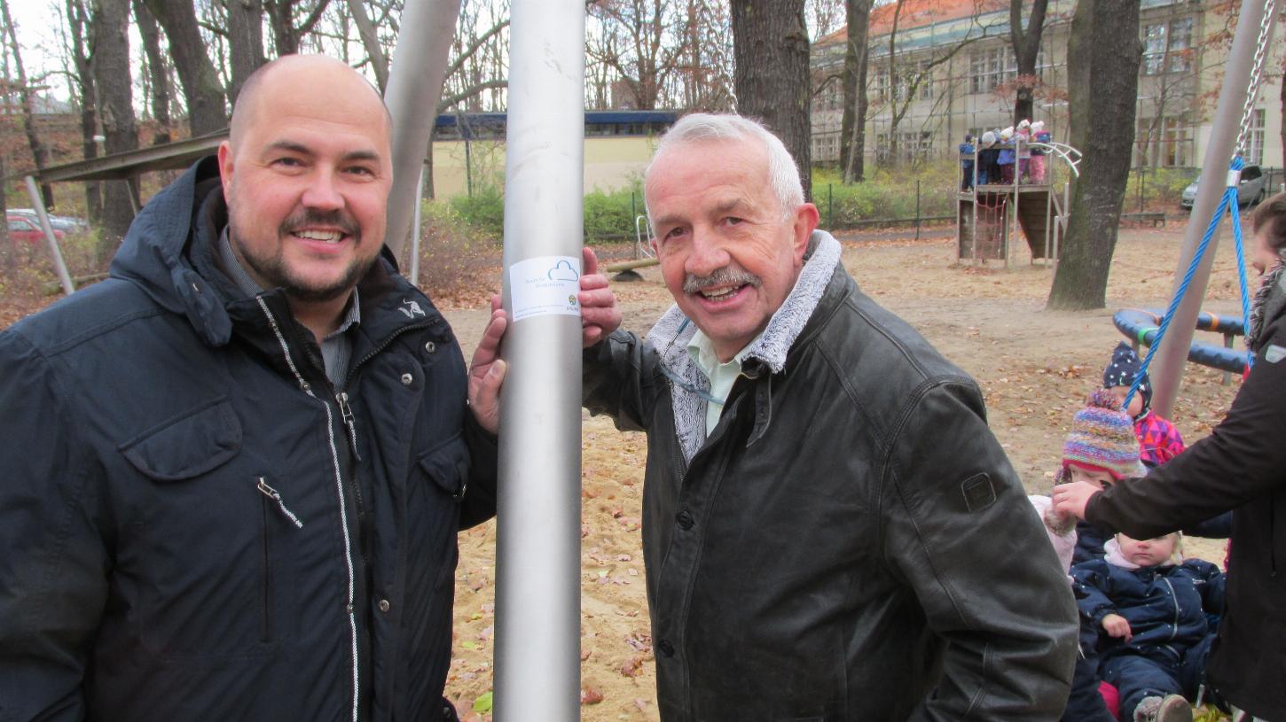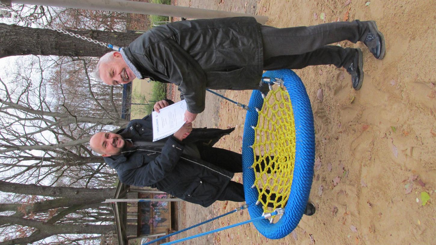 Zur Einweihung der neuen Spielgeräte hatten Bezirksstadtrat Frank Bewig und Wolfgang Mulack, ehemaliger Fußball-Bundesligaprofi, Mitglied bei GOFUS e.V. und weiterer Pate für diesen Spielplatz sowie der langjährige Spielplatzpate der Kinderladen Immerfrech e.V. für den 29. November 2019 alle Interessierten herzlich eingeladen.