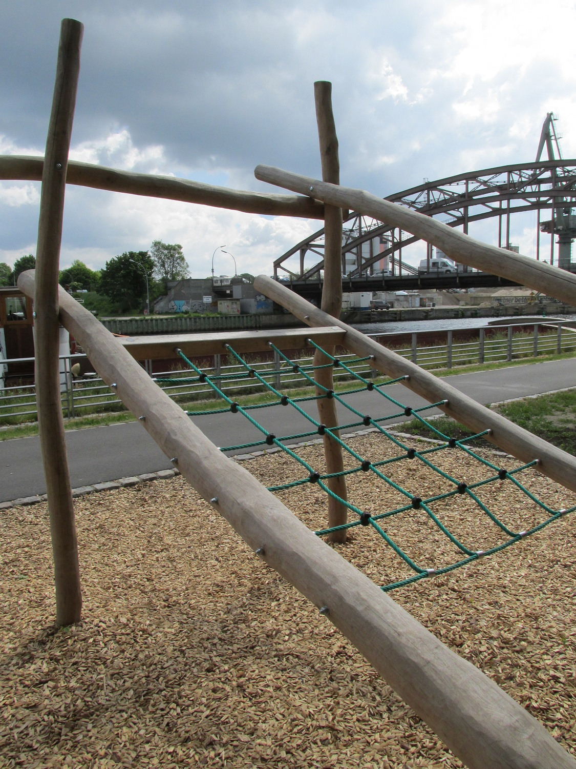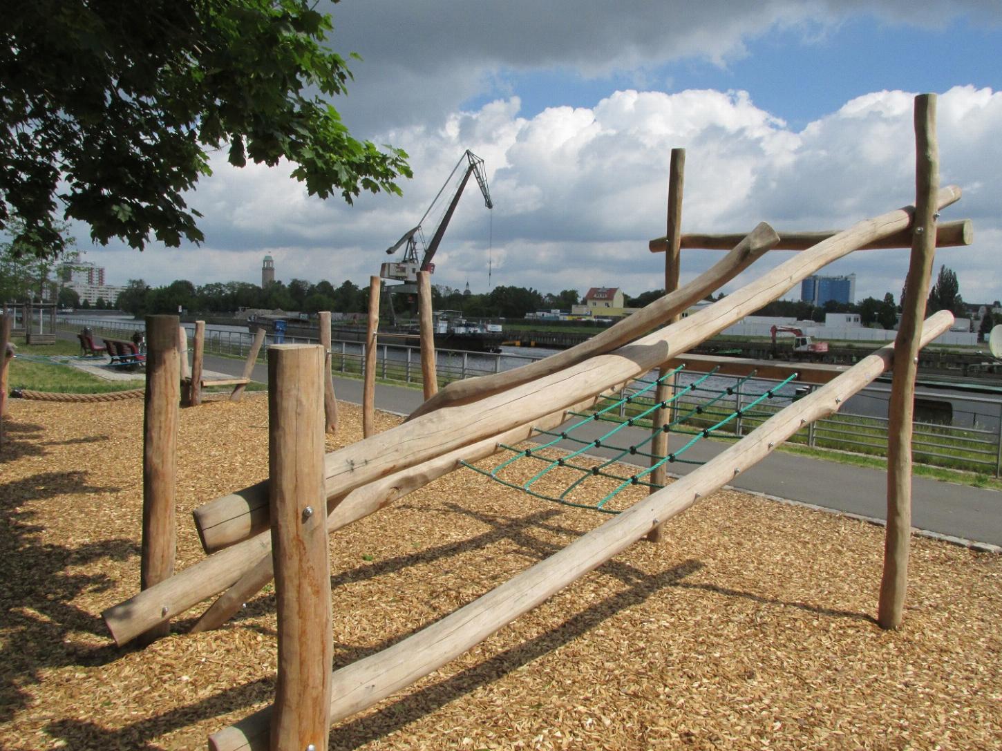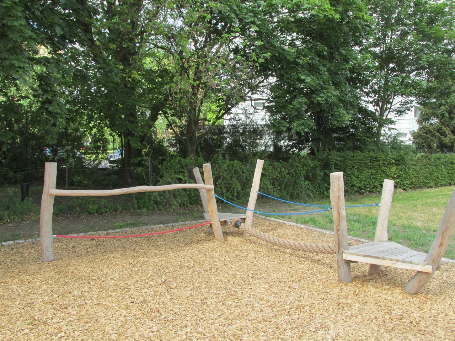 Dieser Spielplatz bietet Möglichkeiten zum Klettern und Balancieren.Spielgeräte