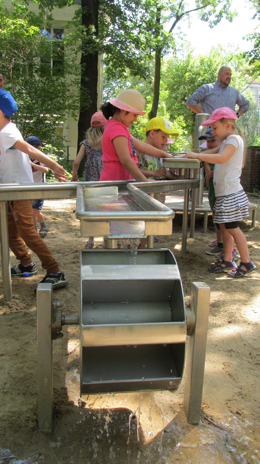 Am 17. Juni 2019 weihten Bezirksstadtrat Frank Bewig und Standortleiter Jürgen Genger der BSH Hausgeräte GmbH gemeinsam mit der Kita Immerfrech als langjähriger Spielplatzpate feierliche die Wasserspielanlage ein.